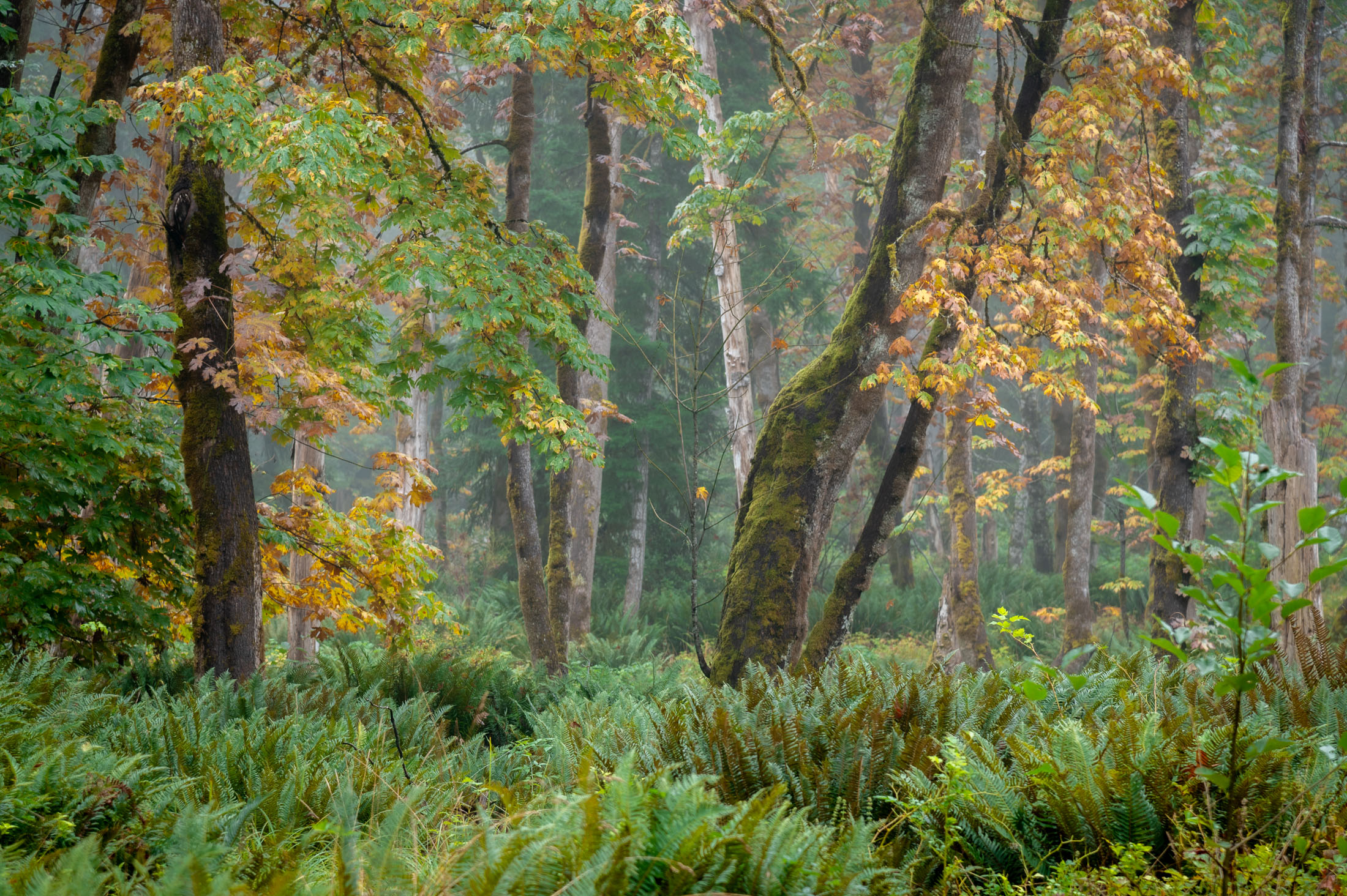 Late afternoon light shines throgh some fog and lights up the forest floor.