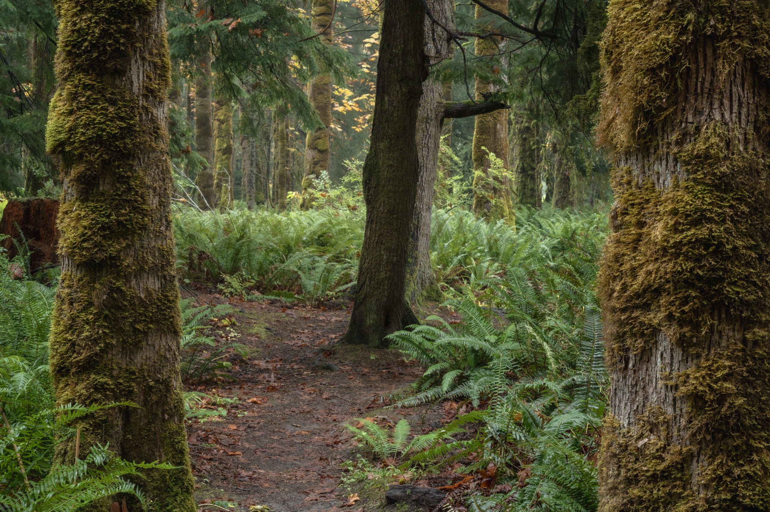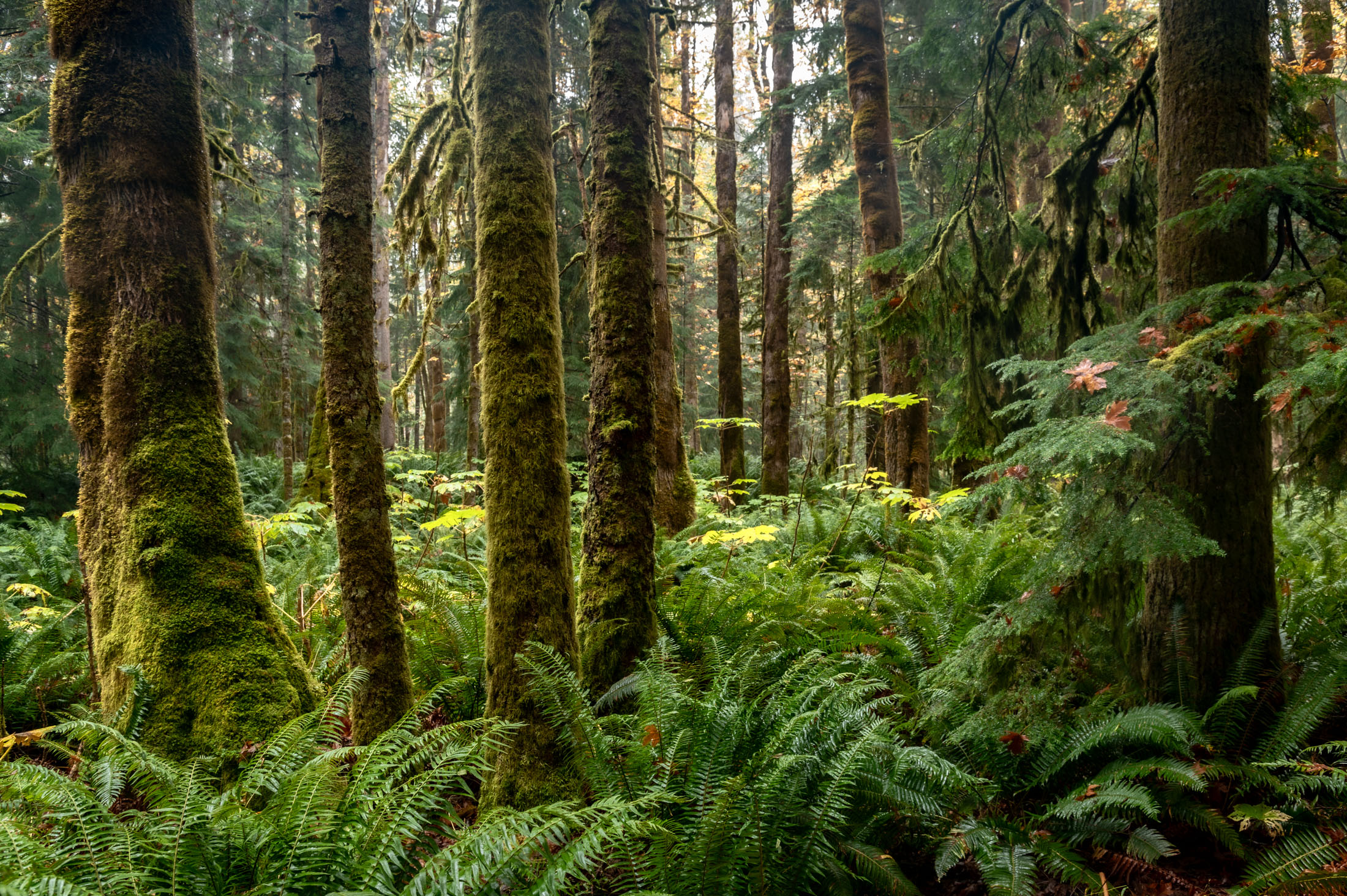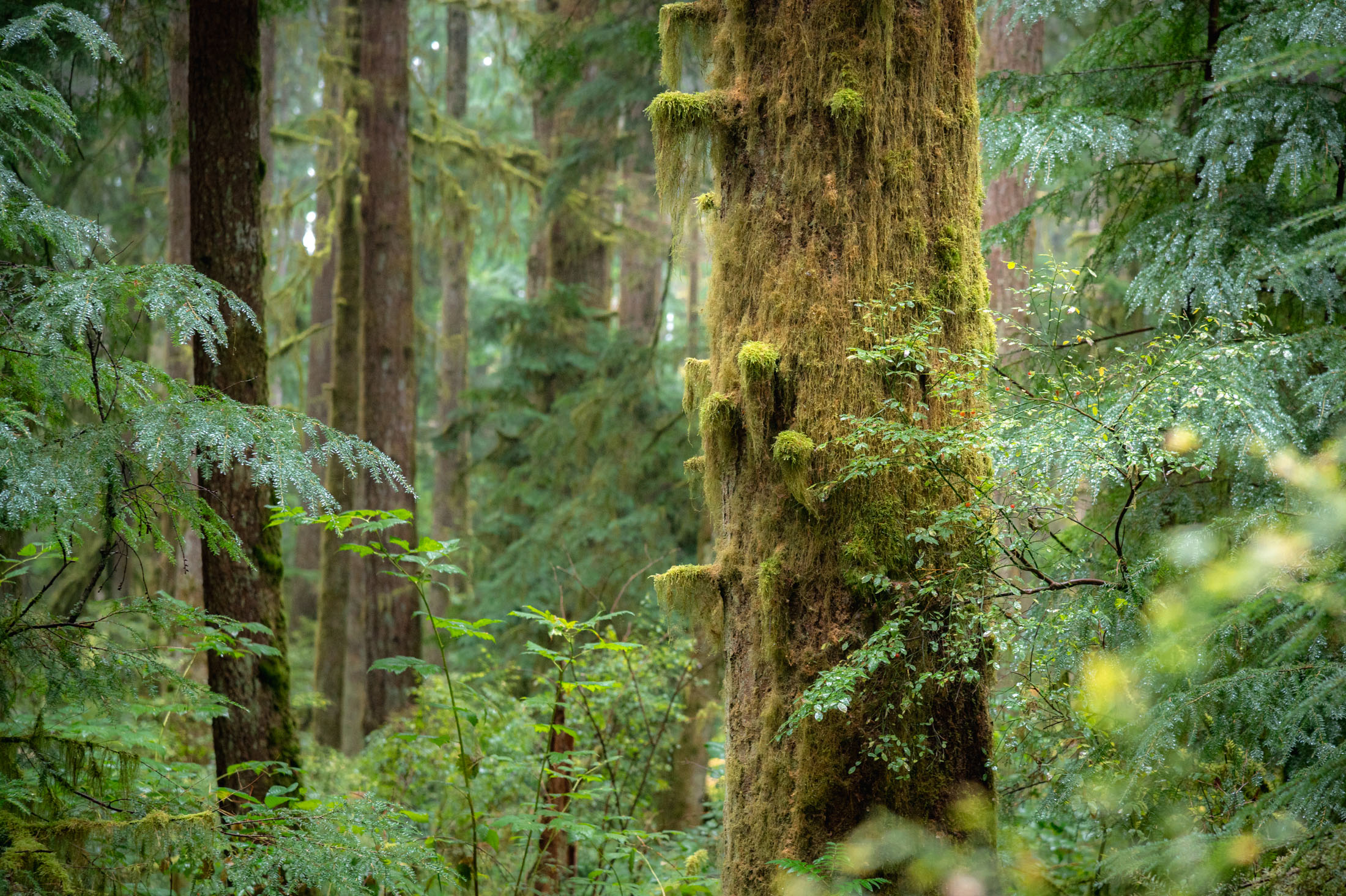 Moss and lichen cling to a tree in lush forest on Vancouver Island